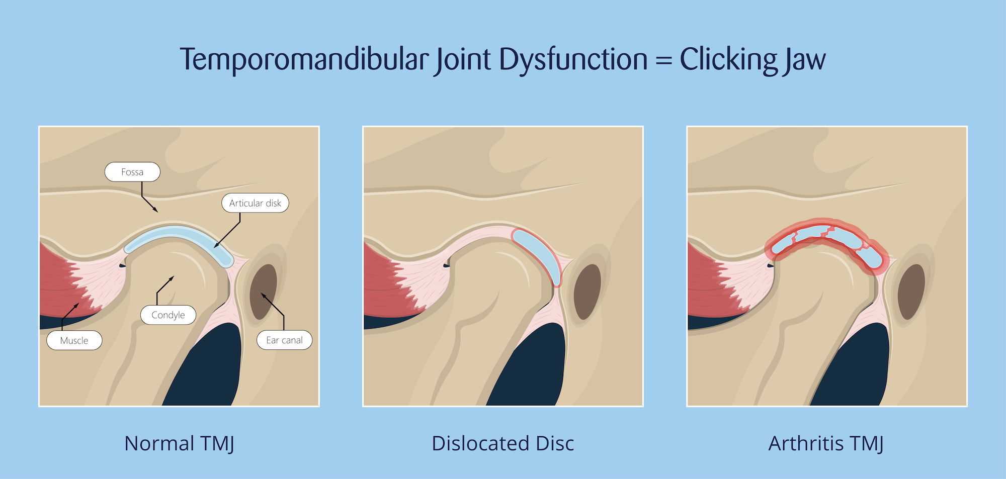 are one and the same, so we will treat the patient for TMJ dysfunction to alleviate their clicking jaw. Depending on what is causing their